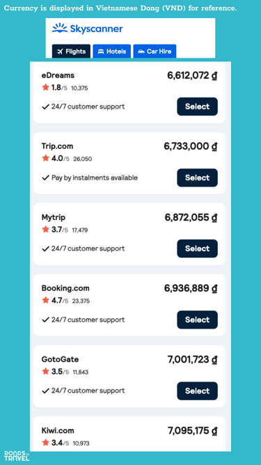 Skyscanner provides a comprehensive price comparison of various booking websites, as shown in the image.