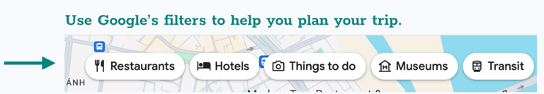 Use Google Maps to get a lay of the land. Search for accommodations, restaurants, bars, and attractions in your destination. Google Maps is excellent for: