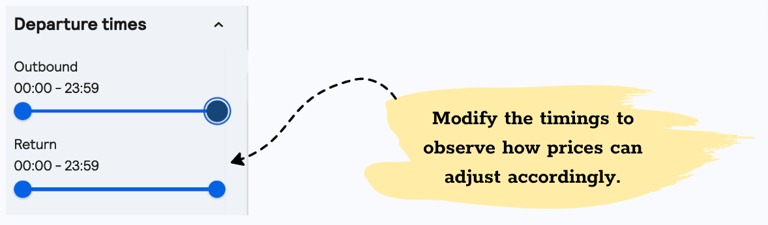 Use the departure times filter to compare prices, as price costs can vary depending on the time. If you have a specific time to reach your destination, this filter is helpful in estimating your flight expenses. Otherwise, feel free to explore different time options.